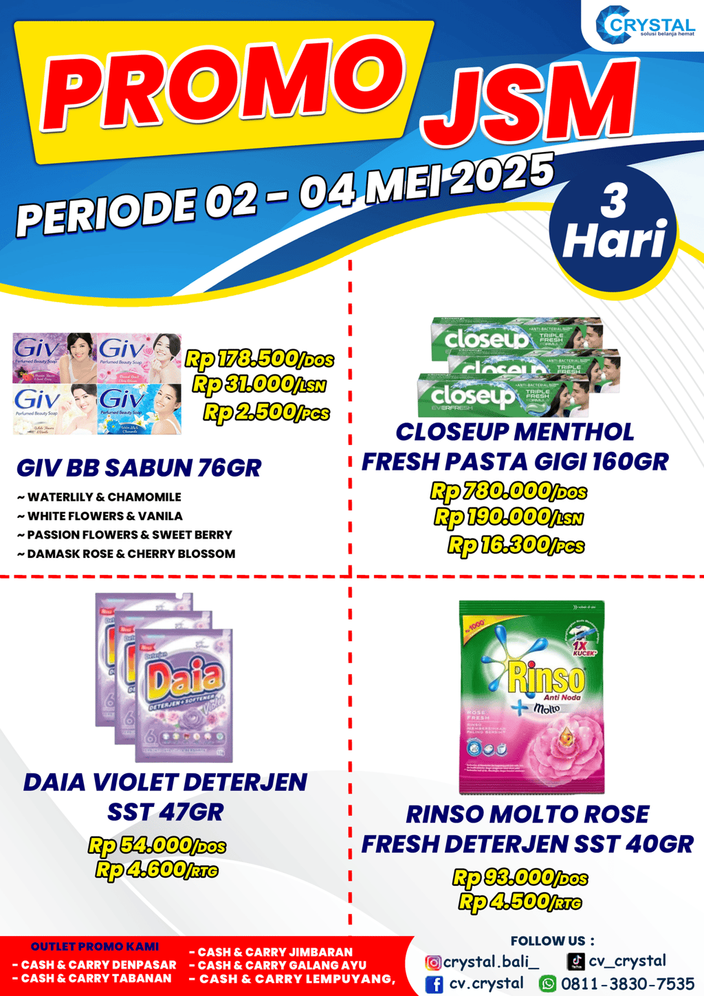 JSM Lagi nih minggu ini. Jangan sampai kelewatan ya guys, promonya cuma dari tanggal 02-04 Mei 2025 aja yak. Langsung gaskan aja ke outlet Cash & Carry Crystal terdekat.